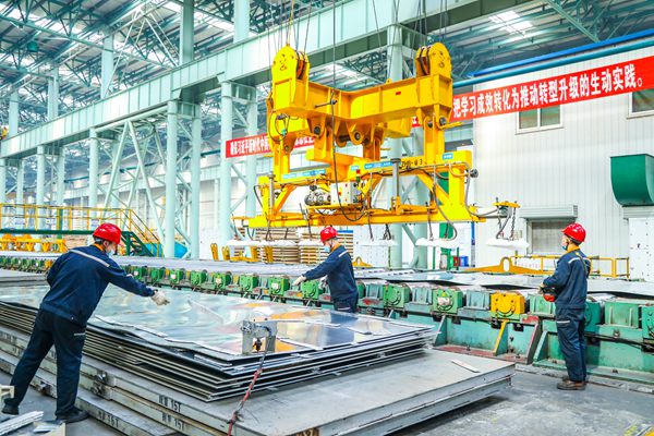 中鋁高端制造東輕中厚板廠生產操作人員吊運合金板材。中鋁高端制造供圖
