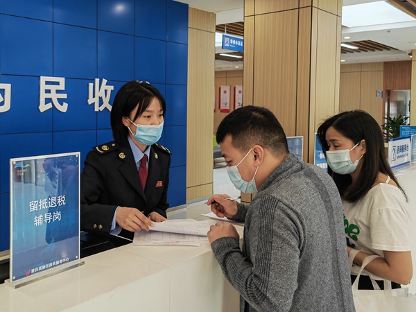 圖為重慶高新區稅務局在辦稅服務廳設置“留抵退稅輔導崗”,及時解答辦稅人員政策咨詢。萬穎攝