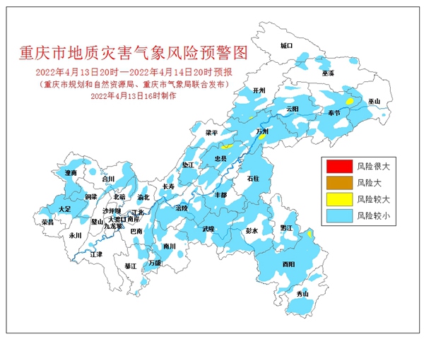 4月13日16時,重慶市規劃和自然資源局、重慶市氣象局聯合發布全市地質災害氣象風險預警。