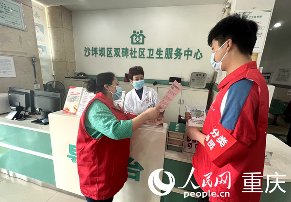 雙碑街道垃圾分類指導員為雙碑社區衛生服務中心醫護人員發放宣傳手冊。人民網 胡虹攝