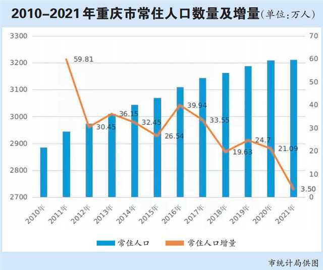 2021年,重慶人口發生了哪些變化?4月14日,市統計局對2021年全市人口變動抽樣調查數據進行解讀稱,2021年全市常住人口為3212.43萬人,與2020年相比,常住人口增加了3.5萬人,連續17年保持增勢。