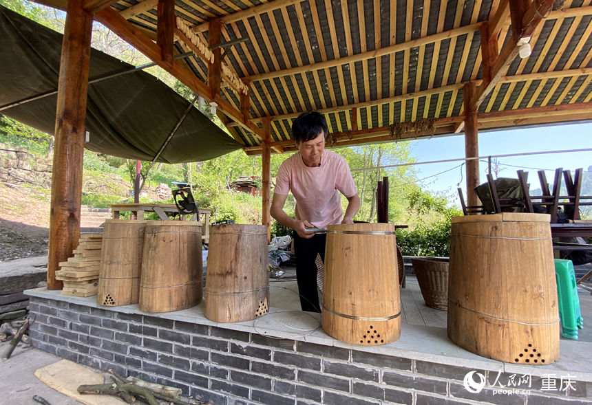劉益洪在家利用廢舊木材制作蜂桶。人民網 劉政寧攝