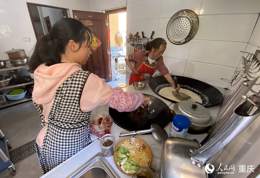 花仁叔(右)和女兒在廚房為客人準備午餐。人民網 劉政寧攝