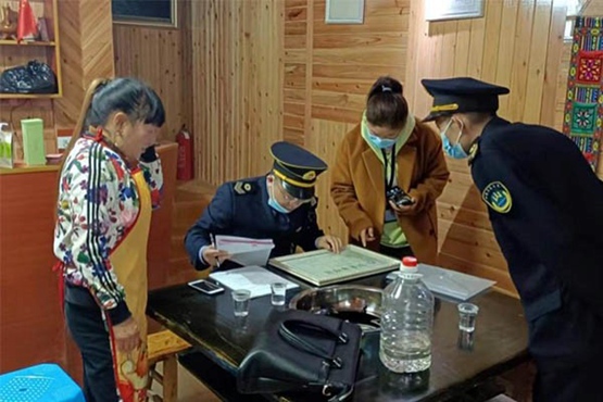 執法人員檢查公共場所衛生許可證持有情況。石柱縣衛生健康綜合行政執法支隊供圖