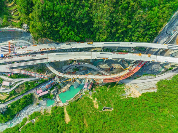 登上雪寶山互通工程最高點俯瞰,只見六條互通匝道、四個方向都可自由通行的“大渦輪”已初見輪廓,主線橋似長虹臥波,又如巨龍凌空,以蒼勁壯美的身姿、磅礴恢宏的氣度,延綿伸向遠方。