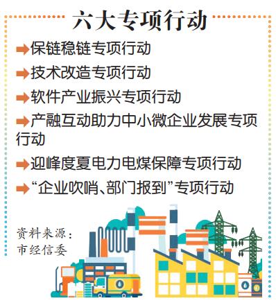 這六大專項行動包括保鏈穩鏈專項行動、技術改造專項行動、軟件產業振興專項行動、產融互動助力中小微企業發展專項行動、迎峰度夏電力電煤保障專項行動和“企業吹哨、部門報到”專項行動。