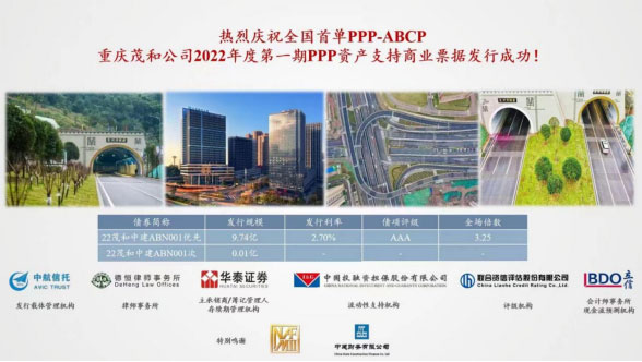 4月25日,中建五局重慶龍洲灣隧道PPP項目ABCP(全稱:重慶茂和基礎設施建設有限公司2022年度第一期中建五局投資PPP資產支持商業票據)在中國銀行間市場交易商協會發行,發行規模9.75億元,其中優先檔票面利率2.7%,入池底層資產為《巴南區龍洲灣隧道項目PPP合同》約定所享有的應收影子通行費及其從屬權利。