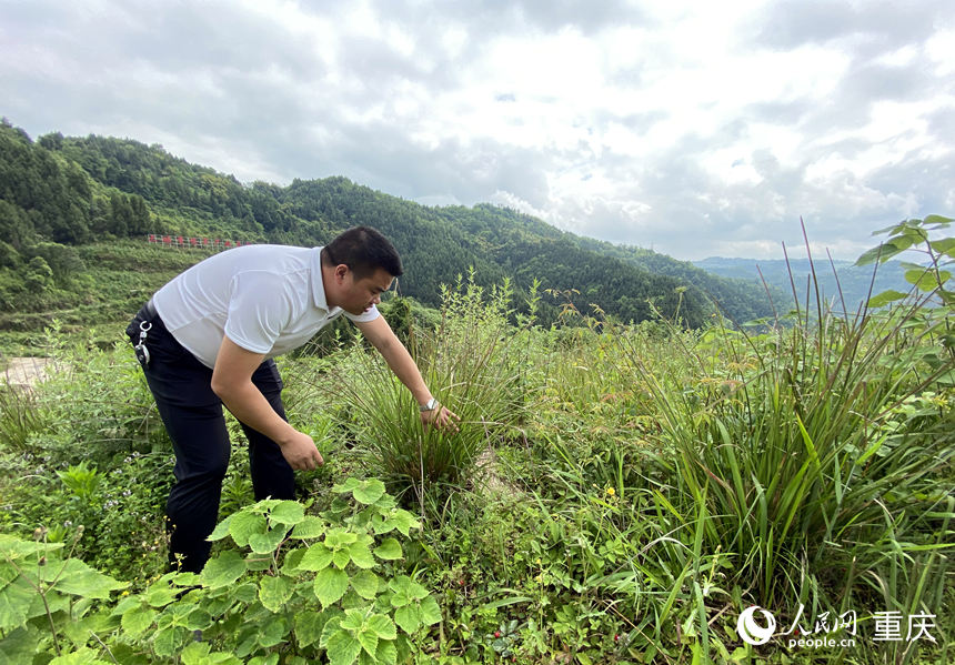 余思成在查看香根草長勢。人民網 劉政寧攝