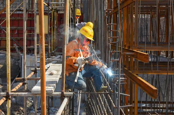 在白馬渠江特大橋拼裝加工場內,來自重慶市合川區的工人王家榮正和幾名工友一道,頭頂烈日在6米高的索塔安裝操作平臺上焊接加固鋼筋。