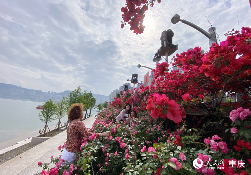 4月25日,萬州濱江環湖區江岸上的三角梅競相綻放、鮮艷奪目,宛如給長江堤岸披上一條紅綢絲帶,吸引了不少市民前來賞花、拍照。57歲的劉蓉幾乎每天都會來江邊走走,“江邊打造得越來越漂亮,和姐妹們在這里賞花散步,心情都會變得格外舒暢!
