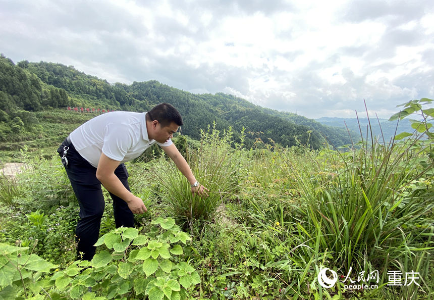 余思成在查看香根草長勢。人民網 劉政寧攝