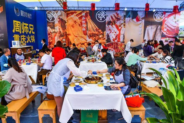 市民在重慶火鍋節現場品嘗火鍋。(資料圖) 鄒樂攝