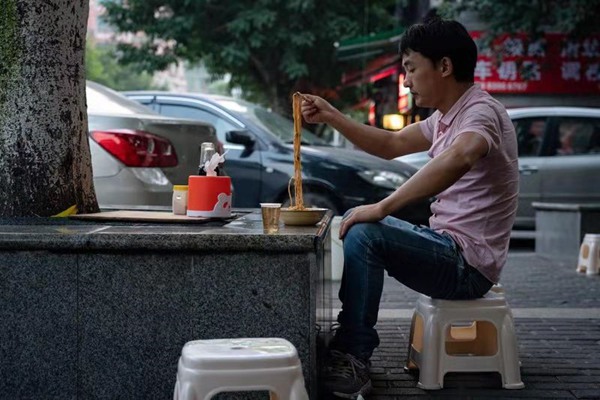 重慶街邊的諸多面攤總是格外紅火——可能面館堂子裝修并不好,甚至桌子都沒有,只能大凳子當桌子客人坐在更小的小凳子上,俗稱“板凳面”。哪怕是西裝革履“衣冠十整”的人們,就這樣在市井中大快朵頤,吃完還要感嘆一聲:“安逸”,透出豪邁的性情。