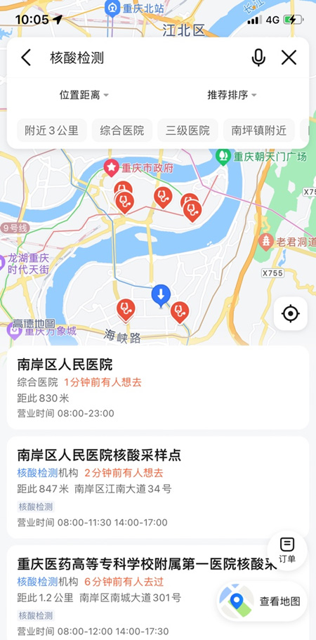 打開高德地圖,搜索“核酸檢測”,即可查找附近采樣點位。重慶市衛健委供圖
