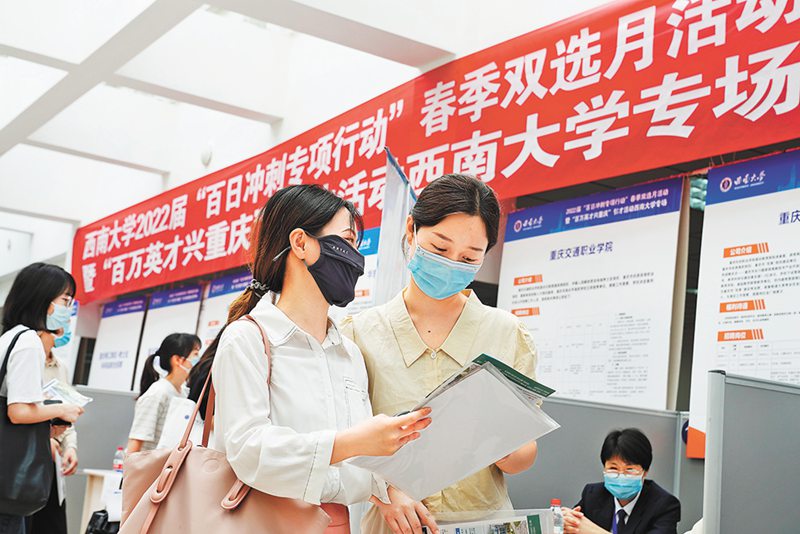 5月13日,在北碚區西南大學招聘大廳,應屆畢業生在參加“百萬英才興重慶”首場高校專場招聘會。當日,80家用人單位提供了教育、人工智能、智能網聯汽車等領域3000多個崗位供應屆畢業生選擇。近年來,我市高校多渠道開展應屆畢業生穩就業、保就業工作,通過“線上+線下”方式暢通招聘單位和求職大學生對接通道,為在校生和畢業生實習、就業等提供幫助。