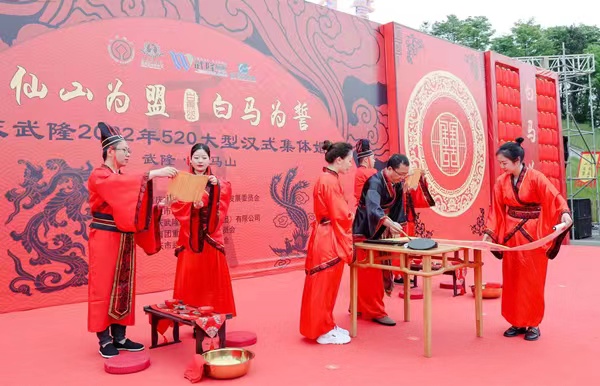 在風景優美的仙女山與隔江相望的白馬山有一段愛情傳說,因此仙女白馬成為“情侶山”,逐漸被人所知曉。本次漢式集體婚禮以“仙山為盟·白馬為誓”為主題,是今年武隆舉辦的首場重大婚慶活動。