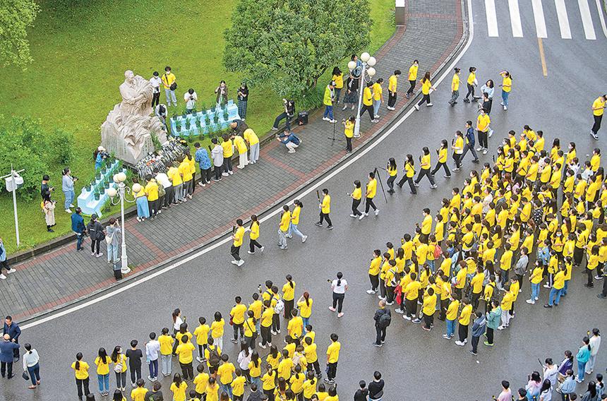 5月22日,西南大學師生來到袁隆平塑像前敬獻鮮花。記者 鄭宇 攝/視覺重慶