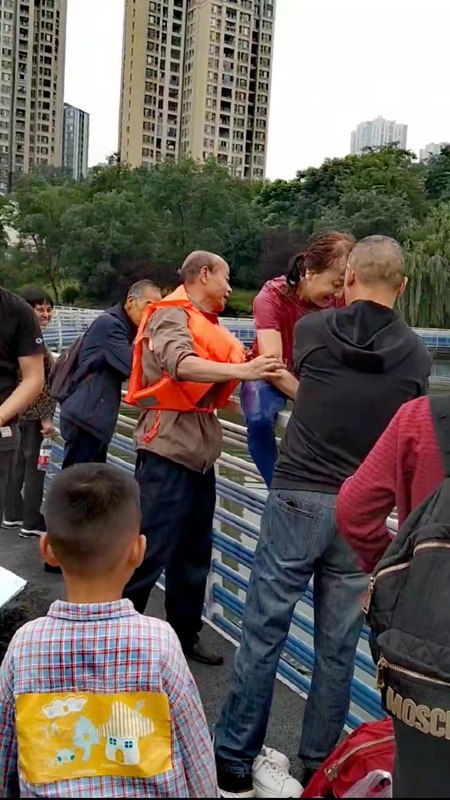 救人之后的文躍琴(右三)被圍觀群眾拉上橋。網友視頻截圖