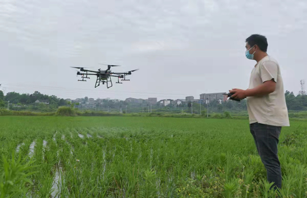 在稻田邊的公路上,合作社工作人員李鵬將配制好的藥水通過水管輸入植保無人機的藥箱后,另一名工作人員隨即在100來米遠的稻田田坎上操作遙控器,植保無人機槳葉快速轉動,升空后迅速來到稻田上方,通過無人機上的4個噴嘴來回噴灑農藥。
