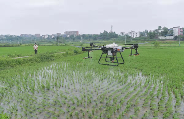 5月24日,在廣安市廣安區大安鎮糧油產業園水稻種植基地,惠民農機農藝專業合作社工作人員正在操作植保無人機對稻田進行噴施農藥作業,通過科技手段助力水稻田間管理。