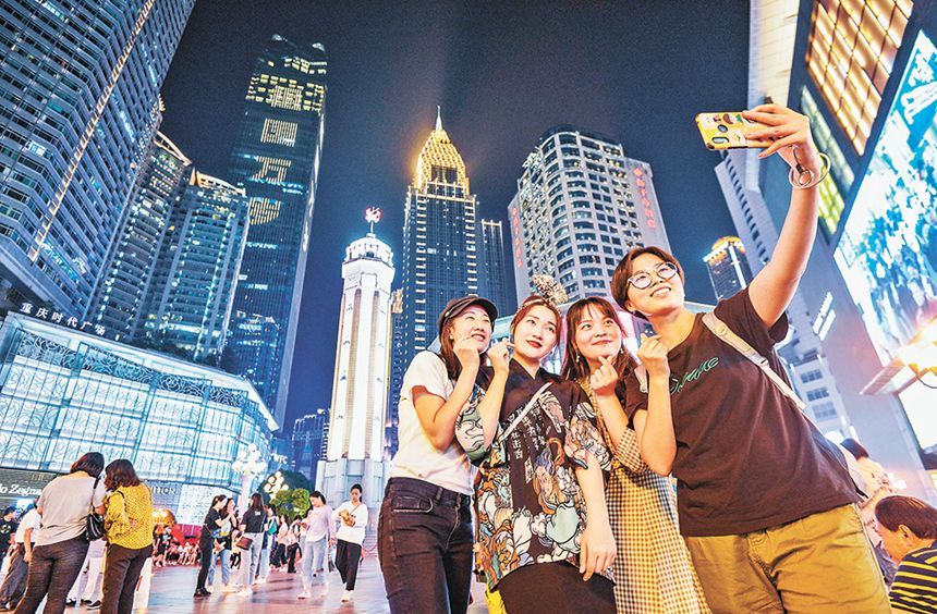 彰顯出國際大都市風范的解放碑商圈,不僅成為購物天堂,而且是重慶的打卡勝地,備受中外游客喜愛。(攝于2019年9月)首席記者 龍帆 攝/視覺重慶