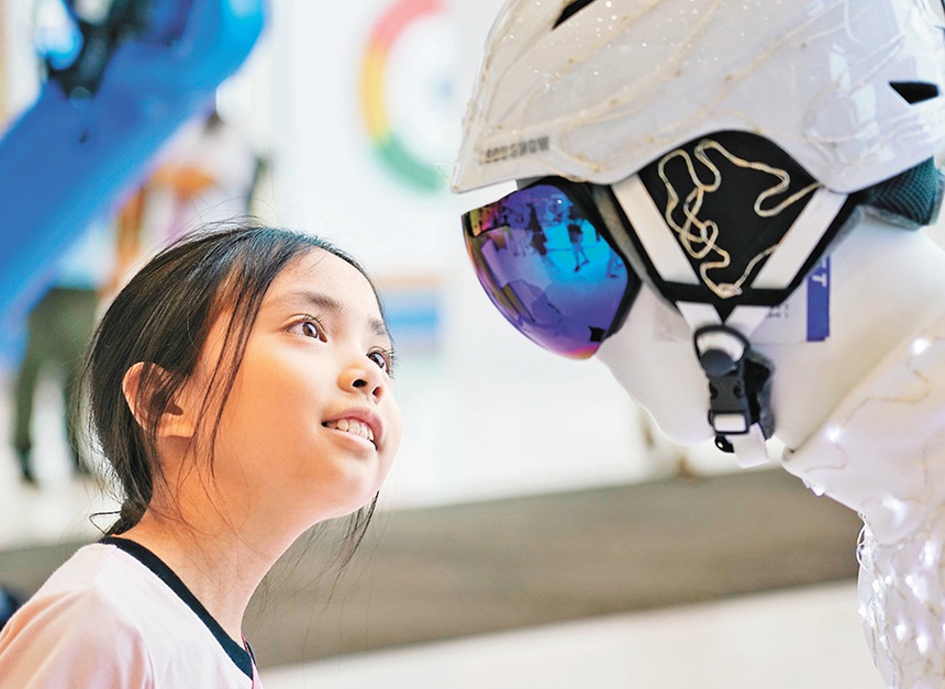 重慶國博中心,一名小姑娘好奇地打量智博會上重慶館展示的石墨烯穿戴設備。(攝于二〇一九年八月二十五日)記者 崔力 攝\視覺重慶
