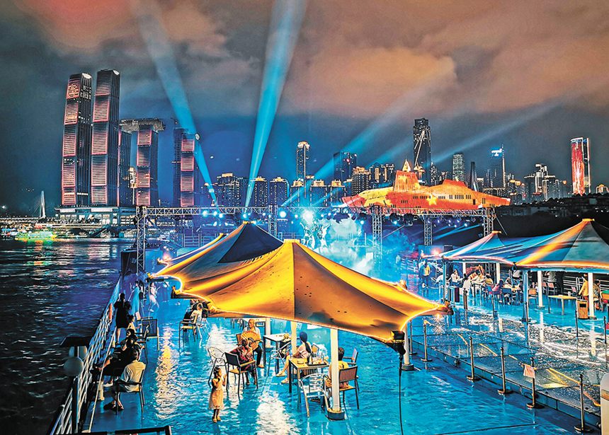 長江“黃金六號”游輪上,游客在甲板上“逛街”賞山城夜景。(攝于二〇二〇年七月二十五日)記者 崔力 攝\視覺重慶