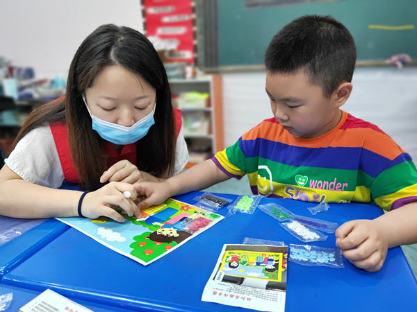“扣子可以變成地球呢!”“扣子可以做成漂亮的花朵和大樹!笨吹骄实膭撘庾髌,在志愿者的指導下,孩子們紛紛動起手來。他們先在紙上畫出要粘貼的輪廓,然后在紐扣后面涂上膠水,再沿著畫好的輪廓進行粘貼。不一會兒,一幅幅充滿童真童趣的環保主題創意畫作就制作好了。