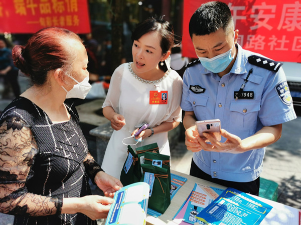民警和志愿者為居民送上端午禮包時進行反詐宣傳;嘏d街道供圖