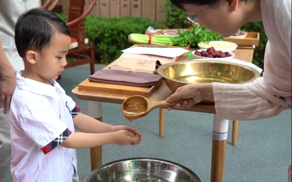 束脩六禮是古代學子入學拜師時,用肉干、芹菜、龍眼干、蓮子、紅棗、紅豆等六種具有象征意義的禮物,表達尊師孝親寓意的禮儀。在莊重的習禮、凈儀、拜請老師、敬奉六禮、正衣冠、四拜禮、誦讀經典、感恩父母等儀程中,學童代表激勵自己在學習生活中踐行傳統智慧,銘記國家民族使命,勿忘世家傳承,讓人動容。