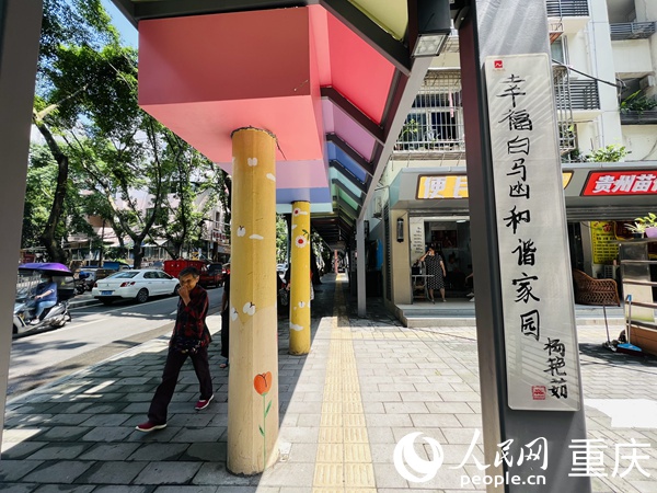 居民的書法作品掛在風雨廊的廊柱上。人民網 胡虹攝
