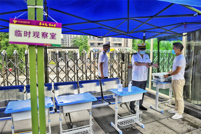 6月2日,聯合執法組的隊員正在對考點的疫情防控設施進行檢查。崔力攝