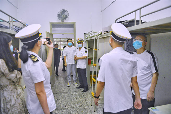 執法組隊員檢查考生集中住宿點疫情防控管理。崔力攝