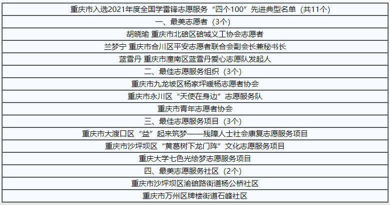 近日,中宣部、中央文明辦等18部門公布了2021年度全國學雷鋒志愿服務“四個100”先進典型名單,重慶3名最美志愿者、3個最佳志愿服務組織、3個最佳志愿服務項目、2個最美志愿服務社區入選。