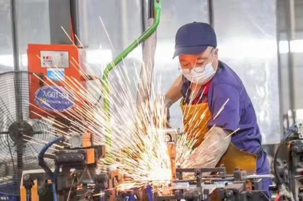 華鎣山經開區正梁機械加工廠的工人在焊接產品。邱海鷹 攝