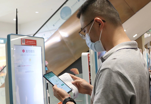 在永輝超市城市生活廣場店自助結賬柜臺,李先生使用數字人民幣錢包支付。張睿攝
