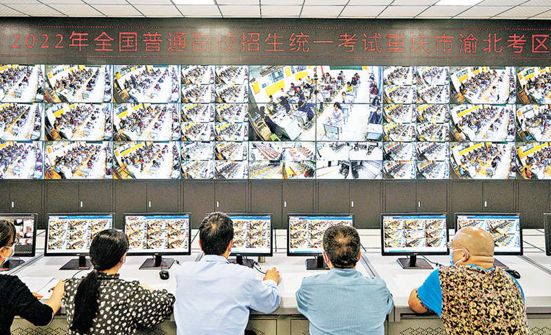6月6日下午,渝北中學考點,工作人員正在監控前查看考場情況。記者 解小溪 攝\視覺重慶