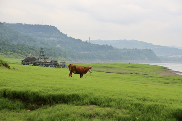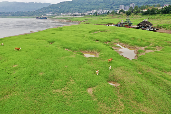 天似穹廬,籠蓋草野,舉目遠眺,綠色的江岸草原,白鷺飛翔、牛群吃草,生機勃勃。在長江涪陵美心紅酒小鎮段,消落帶區域鋪滿了綠茵草坪一樣的“地毯”。