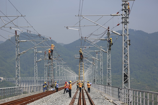 人民網重慶6月16日電 15日上午,在重慶鐵路樞紐東環線御臨河雙線特大橋上,中國鐵路成都局集團公司重慶供電段的職工手持各種工具,正在對線路供電設備進行檢測。標志著重慶鐵路樞紐東環線已進入線路供電設備靜態驗收階段,為線路按期開通運營做準備。