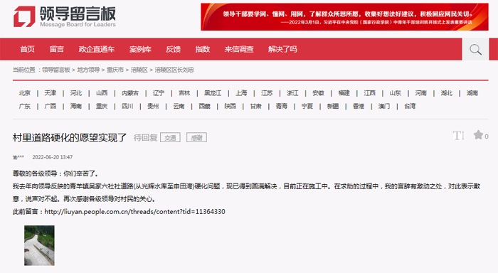 2022年6月20日,在反映問題得到解決后,網友再一次留言,表示對人民網“領導留言板”,對涪陵區青羊鎮人民政府相關工作人員的感謝。“在求助的過程中,我的言辭有激動之處,對此表示歉意,說聲對不起。再次感謝各級領導對村民的關心。”群眾在感謝信中誠摯地說道。