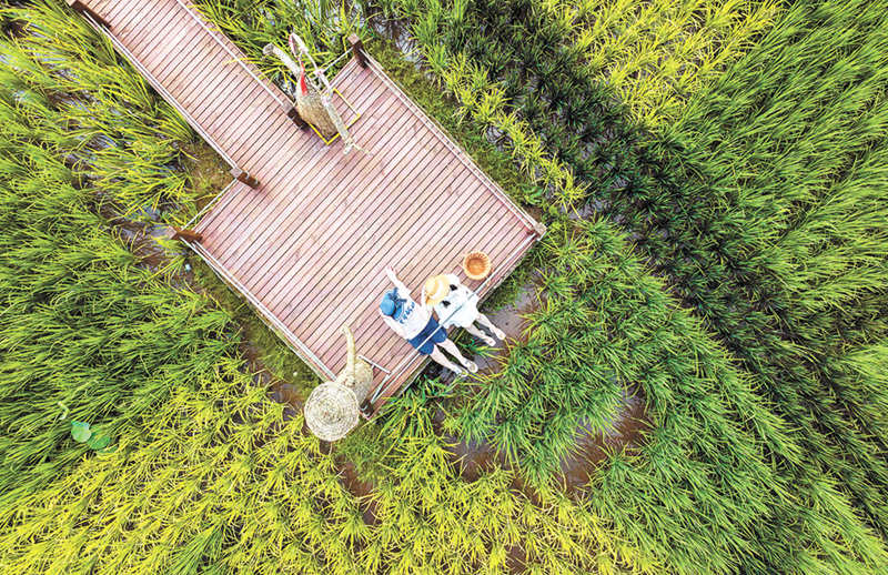 7月3日,在北碚區柳蔭鎮東升村,綠油油的稻田成為旅游景點,不少游客到田間地頭拍照留念,感受田園風光。
