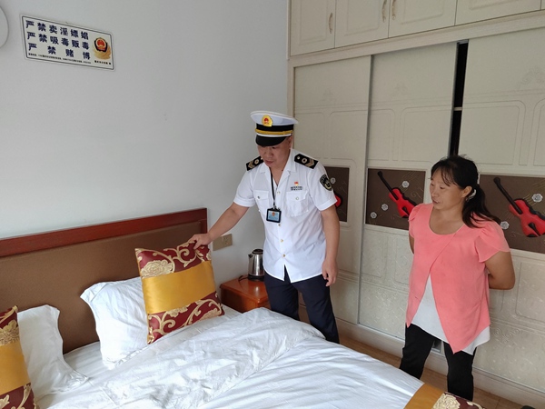 衛生監督員檢查客房衛生。江津區衛生健康綜合行政執法支隊供圖