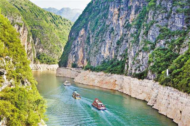 7月24日,游船載著游客暢游在國家AAAAA級景區巫山龍門峽中。