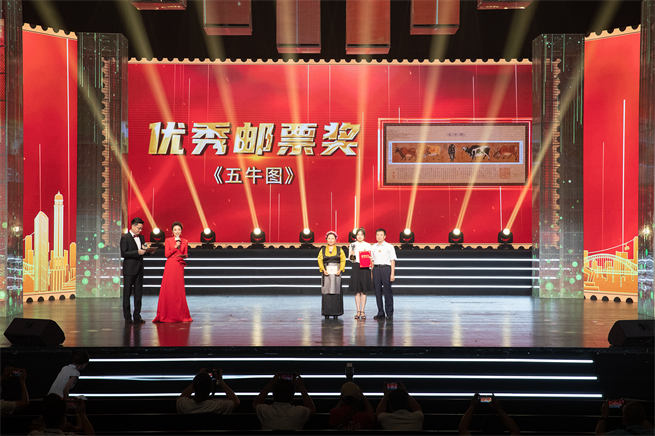 頒獎現場,5套郵票從全國眾多優秀作品中脫穎而出,《中國共產黨成立100周年》《江山如此多嬌》《五牛圖》《<生物多樣性公約>第十五次締約方大會》《國家重點保護野生動物(I級)(三)》五套郵票分獲最佳郵票獎、優秀郵票獎(2套)、最佳設計獎和最佳印刷獎。