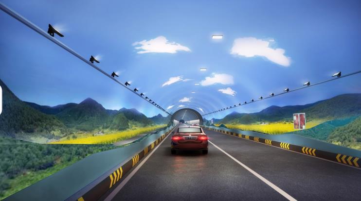 隧道中間共設置4段景觀拓寬段,每段景觀段長100米,前后各設置40米過渡段,展現城開春夏秋冬自然景色,在拓寬段設置起伏的山型裝飾板,底部設置燈具增加可變色景觀照明氛圍,頂部彩繪營造云霧效果,還在全拱圈采用山形云海3D裸眼彩繪,豐富景觀層次,營造舒適行車環境,還在景觀兩旁預留音響設備,鳥叫聲與環境融合。駕乘人員15分鐘左右即可走完整座隧道,穿越過一年四季。