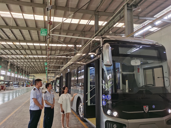 在重慶穗通新能源汽車制造有限公司的生產車間,企業人員向稅務人員介紹公司即將出口菲律賓的純電動公交車。李杰攝