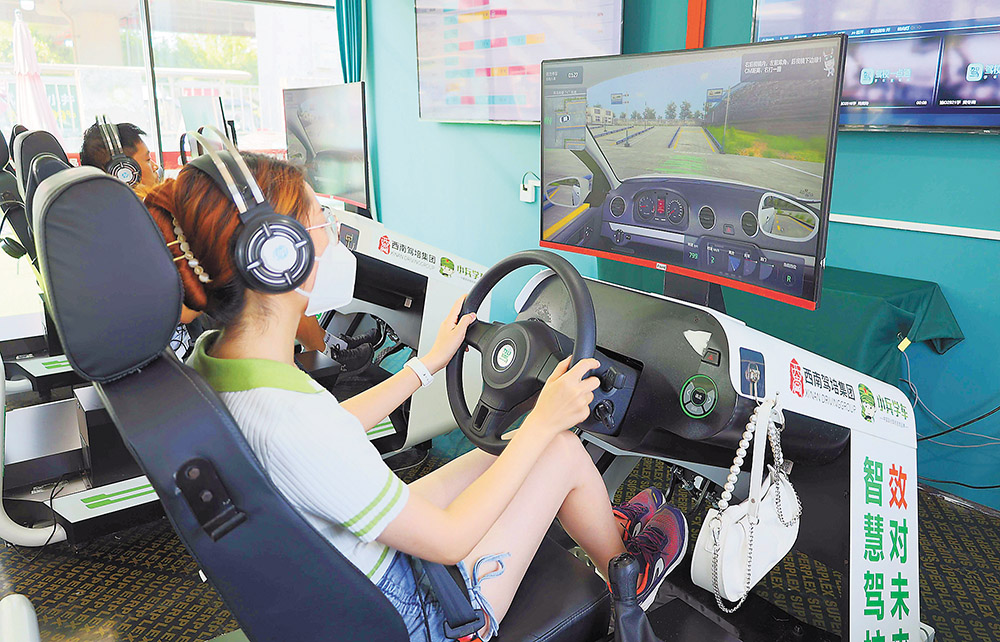 8月9日,在位于沙坪壩區的西南駕培集團鼎吉駕校智能駕駛體驗中心,學員們在AI智能模擬機上進行科目二訓練。