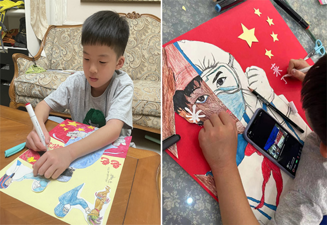 這是兩幅有中國地圖、有五星紅旗、有爸爸和援外隊員身影的畫,色彩豐富,透露著兒子思念爸爸、欽佩爸爸的童心……