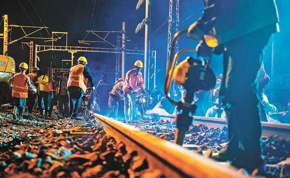 9月3日凌晨,渝利鐵路石柱沙子站增設客運設施項目現場,中鐵一局的工人正在更換鐵軌和道岔。當日,該項目完成了在既有高鐵內鋪設6組道岔的施工任務,為沙子站開通客運業務打下了堅實基礎。