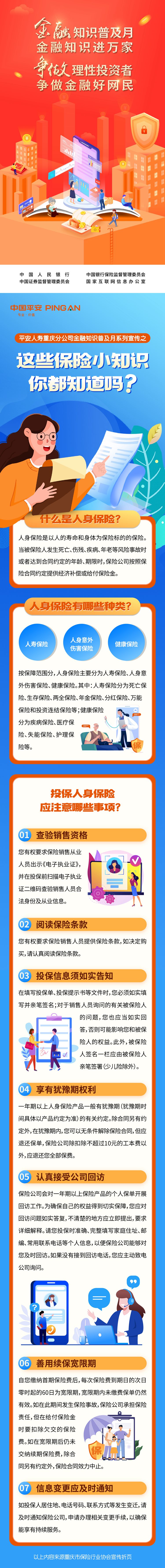 為積極響應中國人民銀行、中國銀保監會、中國證監會、國家網信辦聯合開展的“金融知識普及月 金融知識進萬家 爭做理性投資者 爭做金融好網民”活動,平安人壽重慶分公司面向廣大市民推出“保險知識小課堂”。本期分享主題為《這些保險小知識,你都知道嗎》。(平安人壽重慶分公司)